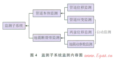 監(jiān)測傳感子系統(tǒng)用于監(jiān)測災情數(shù)據源,是管道風險評價的基礎信息保障,因此監(jiān)測的內容應包含管體應變、管體位移、斷層兩盤位移和地震動參數(shù)等內容(圖4)。