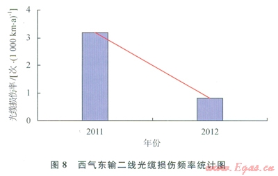 圖7表明,西氣東輸一線管道斷纜頻率由2009年的7.1次/(1090km·a)降至2010年的l.8次/(1000km·a),并呈逐年下降之勢,說明2009年開始逐步實施第三方損壞完整性管理工作后,施工機械等可能威脅管道安全的第三方施工次數(shù)顯著減少,管道安全水平逐步提高。由圖8可以看出,2011年西氣東輸二線投產(chǎn)運行初,在第三方損壞完整性管理指導下光纜中斷次數(shù)處于較低水平,并呈下降趨勢。