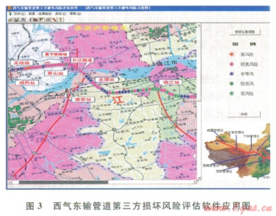 第三方損壞風險評估是評定管道沿線居民、施工單位等對管道的意外損傷或故意破壞所引起管道風險變化情況的技術(shù)。根據(jù)西氣東輸管道第三方損壞風險管理體系,利用自主開發(fā)的西氣東輸管道第三方損壞風險評估軟件(圖3)分別于2009年和2011年從沿線社會環(huán)境、居民關(guān)系、管道敷設(shè)狀態(tài)等第三方損壞的敏感因素人手開展第三方損壞風險評估工作,更新了管道附近的人口密度和工礦企業(yè)分布、管道違章占壓歷史數(shù)據(jù)和第三方施工等情況,確定了西氣東輸管道第三方損壞的風險分布。對比2009年第三方損壞風險評估結(jié)果,中等風險降低了l9.28%,較高風險增加了22.15%,揭示了管道沿線經(jīng)濟發(fā)展、人員活動增加等影響第三方損壞防控的因素正在不斷增多。