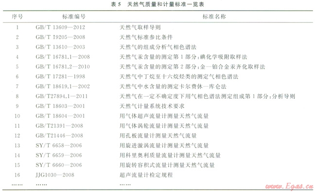 為配合GB l7820《天然氣》和GB/T l8603《天然氣計(jì)量系統(tǒng)技術(shù)要求》的實(shí)施,先后制定了天然氣取樣、組成分析、物性計(jì)算、能量測(cè)定、流量檢測(cè)等50余項(xiàng)國(guó)家和行業(yè)標(biāo)準(zhǔn)(表5),初步構(gòu)建了以GB l7820《天然氣》和GB/T l8603《天然氣計(jì)量系統(tǒng)技術(shù)要求》為核心的質(zhì)量和計(jì)量技術(shù)標(biāo)準(zhǔn)體系,整體達(dá)到國(guó)際先進(jìn)水平。