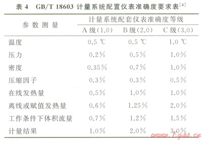 參考0IML Rl40和ENl776,GB/T l8603規(guī)定了新建和改擴(kuò)建的天然氣計(jì)量站貿(mào)易計(jì)量系統(tǒng)的設(shè)計(jì)、配置、建設(shè)、投產(chǎn)運(yùn)行、維護(hù)方面的技術(shù)要求[4](表3),同時(shí)給出了計(jì)量系統(tǒng)儀表的準(zhǔn)確度要求(表4)。成為計(jì)量站建設(shè)和運(yùn)行維護(hù)的依據(jù)。