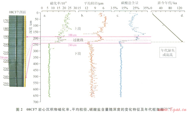 08CF7巖心在琴叁和取樣過程中未遭到人為破壞,且未見明顯生物擾動痕跡,因此能較好地指示其原位沉積特征。巖心觀察發(fā)現(xiàn),沉積物白頂向下以216cm處為界,上部為灰黑色,下部為淺黑色,交界面呈相互穿透狀,整段巖心的沉積物類型均為黏土質(zhì)粉砂。筆者在前期的研究中已對巖心沉積物進(jìn)行粒度、磁化率和碳酸鹽含量測定和分析[34-35],將結(jié)果進(jìn)行綜合對比和分析,發(fā)現(xiàn)這3項指標(biāo)均呈現(xiàn)出相似的變化趨勢,可分為3段:①0~188cm段,各項指標(biāo)變化較大,以磁化率值高,沉積物粒度小及碳酸鹽含量高為特征;②188~240cm段,為各項指標(biāo)和沉積物巖性變化的過渡段;③240cm以下,各項指標(biāo)呈現(xiàn)均一性變化,相對以磁化率值低,沉積物較粗及碳酸鹽含量低為特征(圖2)。