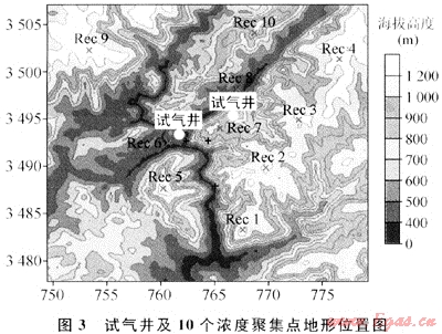 擴散模型計算的參數(shù)為原料氣組分體積分數(shù)(CH470.6%、H2S20.0%、CO28.93%),原料氣量(70×104m3/d),爐膛設計排出氣體速度(21.23m/s),排出溫度(924℃),氣井所處地形、地貌及氣象等數(shù)據(jù);模型計算采用的試氣井及周邊10km范圍10個濃度聚集點的地形位置參見圖3。