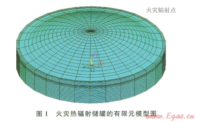 其中承壓環(huán)及襯板用shelll31單元建立、其他部分可用實(shí)體單元solid70。有限元模型求解的是連續(xù)體問(wèn)題,但在此模型中,安全閥的位置離穹頂約16m,是非連續(xù)孤立的節(jié)點(diǎn)。為了能讓安全閥的熱輻射能傳遞到穹頂。必須借助一類(lèi)特殊的單元即表面效應(yīng)單元,實(shí)現(xiàn)孤立火災(zāi)點(diǎn)和儲(chǔ)罐各個(gè)部分的熱輻射。