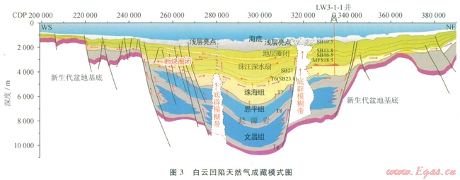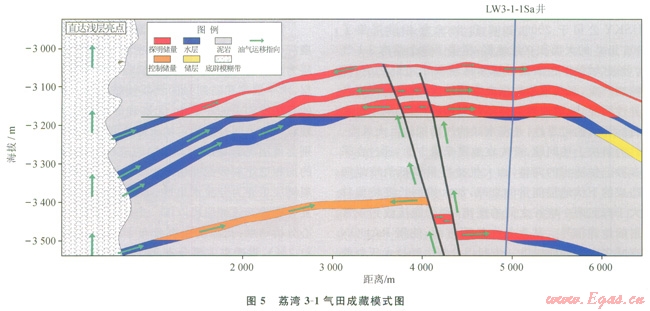 總體說來,荔灣3-1構(gòu)造是一個(gè)具有古基底高背景的晚漸新世淺海陸架三角洲體系、早中新世富砂深水扇體系下的斷裂—背斜—地層復(fù)合圈閉。其天然氣成藏聚集是近源晚期階段性累積成藏的產(chǎn)物。在中中新世以后(距今8~0Ma),主要來自白云凹陷主洼東部斜坡帶恩平組(現(xiàn)埋深在4600~6000m)有效烴源巖生成的天然氣,通過斷層和流體底辟向上進(jìn)行垂向運(yùn)移,然后沿區(qū)域砂體+不整合面+構(gòu)造脊綜合輸導(dǎo)體系進(jìn)行側(cè)向運(yùn)移,進(jìn)入荔灣3-1這個(gè)大型的以披覆背斜為主的斷裂背斜地層復(fù)合型圈閉,在上覆巨厚的新近系海相泥巖的封蓋下,形成荔灣3-1大氣田(圖5)。