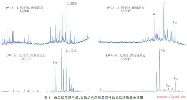 烴源巖樣品有機(jī)地球化學(xué)分析表明(表1、圖l),恩平組淺湖相、沼澤相烴源巖殘余有機(jī)碳含量(TOC)變化大(1.12%~56.18%),生烴潛力指數(shù)(Pg)較高(0.56~97.47mg/g);氫指數(shù)(HI)較低,介于50~300mg/g,有機(jī)質(zhì)類型為偏腐殖型干酪根;Pr/Ph為1.6~5.9,沉積環(huán)境變化大;C29規(guī)則甾烷優(yōu)勢(shì),貧4-甲基甾烷系列;富含陸源三萜類生物標(biāo)志物,如W、T樹脂化合物含量高,奧利烷含量較低—中等。文昌組湖相烴源巖殘余有機(jī)碳含量適中(1.00%~2.50%),生烴潛力指數(shù)較高(8.18~l3.64mg/g);氫指數(shù)較高,介于446~566mg/g,有機(jī)質(zhì)類型為偏腐泥型干酪根;Pr/Ph為1.4~1.7,沉積環(huán)境為還原環(huán)境;與盆地北部珠一地區(qū)富生烴凹陷文昌組烴源巖特征不一樣,白云凹陷文昌組來源于藻類的C27規(guī)則甾烷含量較高,而貧4-甲基甾烷系列,推測(cè)當(dāng)時(shí)可能因處于不同的湖泊環(huán)境,其水生生物的種類也不同而導(dǎo)致;貧陸源三萜類生物標(biāo)志物,如W、T樹脂化合物和奧利烷含量低(或難于檢測(cè))。烴源巖有機(jī)質(zhì)及生態(tài)組分中富含無定型和浮游藻類。