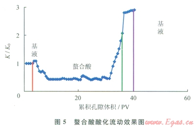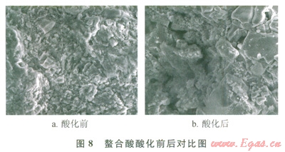 實驗結(jié)果表明:經(jīng)過螯合酸酸化后巖心滲透率顯著提高,滲透率提高將近3倍,而經(jīng)過土酸酸化后巖心滲透率降低,降低幅度達(dá)50%,且使用土酸進行酸化流動過程中出現(xiàn)巖心脫砂現(xiàn)象,而螯合酸沒有出現(xiàn)脫砂問題,電鏡掃描結(jié)果也顯示土酸酸化后巖心的骨架結(jié)構(gòu)破壞,表面膠結(jié)強度降低,黏土礦物結(jié)構(gòu)遭到破壞,所以出現(xiàn)砂現(xiàn)象。通過掃描螯合酸酸化流動前后巖心端面發(fā)現(xiàn),巖石骨架結(jié)構(gòu)未被破壞,且出現(xiàn)明顯的溶蝕孔道,從掃描電鏡看出酸化流動后巖石的膠結(jié)情況完好,未出現(xiàn)結(jié)構(gòu)破壞現(xiàn)象。