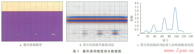 圖2-b是橢圓形溶洞偏移剖面,圖2-c為橢圓形溶洞最大波峰振幅曲線圖;圖3-b、圖3-c分別是菱形溶洞偏移剖面及最大波峰振幅曲線圖??梢钥吹剑瑹o論是橢圓形模型還是菱形模型,隨著溶洞橫向尺度的增加最大波峰振幅是增加的,這和長方形溶洞正演模擬結(jié)果很相似。