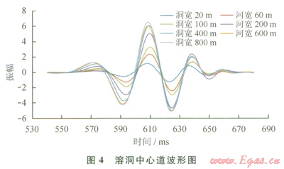 以長方形溶洞模型為例,提取偏移數(shù)據(jù)溶洞響應(yīng)中心道,其波形圖如圖4所示。由圖4可見:各個地震道除振幅強(qiáng)弱不同外,其波形特征大致相同,為兩強(qiáng)谷夾一強(qiáng)峰且峰強(qiáng)于谷的特征;各道波形時長大致相同,這說明溶洞地震響應(yīng)時長與溶洞寬度沒有必然聯(lián)系;振幅雖然隨著溶洞橫向尺度的增大而增大,但是增大的幅度是在不斷減小的,尤其當(dāng)溶洞寬度大于200m后,溶洞對應(yīng)的最大波峰振幅的增加近乎停止。
