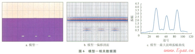 圖6、7分別是模型一和模型二的相關(guān)數(shù)據(jù),由圖6-c可知,模型一中溶洞對應(yīng)振幅的關(guān)系為:長方形溶洞>不規(guī)則溶洞>半圓形溶洞,這與溶洞面積關(guān)系是一致的,且模型一中第l個溶洞和第3個溶洞形態(tài)大小差距很小,但在最大波峰振幅曲線上依然可以將兩者區(qū)分開,由圖7-c可知模型二也有相似的結(jié)論,故而在菲涅爾帶內(nèi)溶洞形態(tài)對于振幅是敏感的。