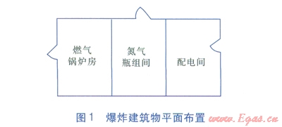 2012年6月某燃?xì)鉄犭姀S發(fā)生爆炸,造成兩死一傷。爆炸地點位于燃?xì)怆姀S內(nèi)的一座附屬建筑物(現(xiàn)澆框架式結(jié)構(gòu))內(nèi),爆炸建筑物平面布置見圖1。監(jiān)控錄像顯示,爆炸發(fā)生前有兩名人員先后進(jìn)入配電間,2min后發(fā)生爆炸,爆炸沖擊波半徑超過30m。約l5min后消防及救援人員趕到現(xiàn)場,使用消火栓撲滅零星明火。事故現(xiàn)場勘察顯示,配電間3面外墻向外坍塌,建筑物內(nèi)2面隔墻均向燃?xì)忮仩t房方向垮塌。配電間內(nèi)有兩排配電柜,無超大型變壓器設(shè)備,多個配電柜門被炸飛,配電柜內(nèi)有燒結(jié)痕跡。氮氣瓶、氮氣匯流管及安全放散管(放散口設(shè)置在室內(nèi))傾倒在燃?xì)忮仩t房與氮氣瓶組間之間的隔墻一側(cè),放散口有積碳現(xiàn)象,放散口上方墻體有噴射火焰燃燒過的痕跡。