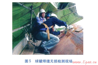由特種設(shè)備檢測(cè)機(jī)構(gòu)對(duì)球罐進(jìn)行全面檢測(cè)。檢測(cè)項(xiàng)目包括宏觀檢測(cè)、壁厚測(cè)定、焊縫無損檢測(cè)、安全附件檢測(cè)等。焊縫無損檢測(cè)包括超聲波檢測(cè)、射線檢測(cè)、磁粉檢測(cè)、滲透檢測(cè)等。球罐焊縫無損檢測(cè)現(xiàn)場(chǎng)見圖5。