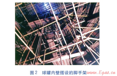 球罐直徑大(如容積為l000m3的球罐內(nèi)直徑為12.3m,容積為l0000m3的球罐內(nèi)直徑為27m),罐頂離地面距離大。GB/T 3608—2008((高處作業(yè)分級(jí)》規(guī)定,在距墜落高度基準(zhǔn)面2m及以上有可能墜落的作業(yè)均屬于高空作業(yè)。因此開罐檢驗(yàn)為高空作業(yè),為了保障施工人員的安全,球罐內(nèi)外壁必須搭設(shè)腳手架。球罐內(nèi)、外壁搭設(shè)的腳手架分別見圖2、3。