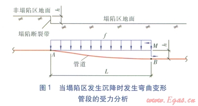 在正常情況下,管道自重(包括供熱介質(zhì)重量)加上部土壤重量等于管道下部土壤的支撐力,無(wú)論是有補(bǔ)償管道還是無(wú)補(bǔ)償管道,管道不會(huì)出現(xiàn)彎曲變形。然而,當(dāng)塌陷區(qū)發(fā)生沉降時(shí),由于管道的連續(xù)性,塌陷斷裂帶的塌陷區(qū)一側(cè)部分管段將發(fā)生彎曲變形(見(jiàn)圖l),并出現(xiàn)懸空現(xiàn)象,使得管道上部出現(xiàn)均布荷載,直至彎曲變形終止。當(dāng)塌陷區(qū)發(fā)生沉降時(shí)發(fā)生彎曲變形管段的受力分析見(jiàn)圖l。