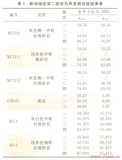 考慮到工區(qū)鉆井的分布,選擇CX565、X5、XC203、XCl2等4口井6組樣品進(jìn)行了聲發(fā)射實(shí)驗(yàn);通過(guò)單軸應(yīng)力加載,使用聲波檢測(cè)儀器接收聲發(fā)射特征參數(shù)(包括聲發(fā)射次數(shù)、事件率和能率),獲得聲發(fā)射特征參數(shù)與加載時(shí)間之間的關(guān)系,反映出新場(chǎng)地區(qū)須二段經(jīng)歷了’多期的受力歷史,一般能劃分出3~4級(jí)Kaiser效應(yīng)點(diǎn),至少對(duì)應(yīng)了4期破裂歷史(表1)。