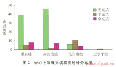 裂縫的充填特征決定了后期裂縫的有效性,對(duì)須二段裂縫充填性的統(tǒng)計(jì)結(jié)果表明:垂直和高角度裂縫主要為未充填縫,該類(lèi)裂縫達(dá)到70.54%;半充填縫和全充填縫均占l4.73%,全充填裂縫主要為低角度縫。因此從裂縫有效性來(lái)看,該區(qū)須二段裂縫有效性高,且有效裂縫主要以垂直縫和高角度縫為主(圖2) [9]。