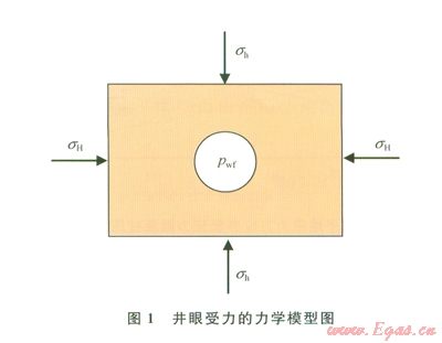 任何一口油氣井鉆開前原地應力就已存在于地層巖石中,油氣井眼鉆開后,井內(nèi)流體壓力取代了被鉆巖層提供的支撐,無疑會引起井眼周圍巖石應力的重新分布[21-22]。假設井眼周圍的地層為多孔彈性介質(zhì),其應力分布可用以下力學模型求解:在無限大平面上,一圓孔受均勻的內(nèi)壓,而在這個平面的無限遠處受兩個水平地應力的作用,在垂直方向上受上覆巖層壓力作用,如圖l所示。由于井周地層應力最大的點出現(xiàn)在井壁上[23],筆者僅給出了井壁上的應力分布公式。直井井壁圍巖有效應力為[23]:
