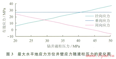 式中s′r、s′q、s′z,分別為井壁徑向、周向、垂向的有效應力;pwf井內(nèi)液柱壓力;pp為地層壓力;m為巖石泊松比;m為井周角(井壁上某點的失徑與最大水平地應力方位的夾角) sH、sh分別為最大、最小水平地應力。