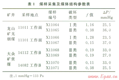 龍山礦和大眾礦均為突出礦井,在龍山礦同時具有軟硬煤的地點采集了4組煤樣;大眾礦煤質(zhì)較軟,采集了4組軟煤煤樣,測試煤的堅固性系數(shù)f值和瓦斯放散初速度DP。煤樣采集信息及煤體結(jié)構(gòu)參數(shù)見表1。