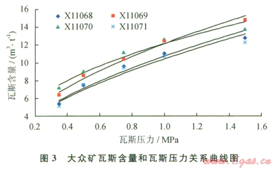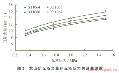 3)實驗室研究了瓦斯含量和瓦斯壓力的相互關系,龍山礦無煙煤瓦斯壓力0.74MPa對應的瓦斯含量為l0.9~12.6m3/t,最低為l0.9m3/t;大眾礦貧煤對應的瓦斯含量為9.04~10.7m3/t,最低為9.04m3/t。