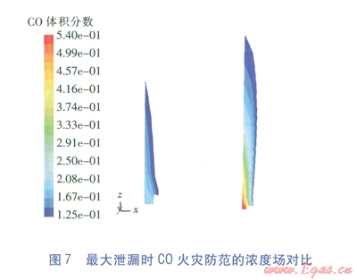 C0是CRG的主要叮燃組分,在12.5%~74.0%的爆炸極限范圍內(nèi)均可燃,且其密度與空氣相近,泄漏后較難快速散失,會(huì)混入地面空氣中產(chǎn)生橫向蔓延,因此研究考慮的C0防火控制體積分?jǐn)?shù)取其爆炸下限l2.5%,即低于該含量均屬安全。