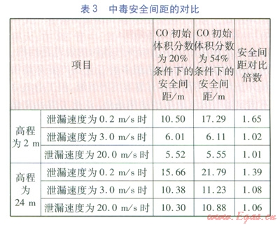 FLUENT軟件雖具有很高的權(quán)威性,但該空間模型還較簡(jiǎn)單。危害氣體源僅考慮CO,忽略其他氣體(如H2)的影響??赏ㄟ^理論擴(kuò)散計(jì)算對(duì)微量泄漏工況進(jìn)行驗(yàn)證(無初速度和重力影響)。理論擴(kuò)散計(jì)算得知,對(duì)微量泄漏,2m高程處,C0體積分?jǐn)?shù)達(dá)到0.02%時(shí)7C0初始體積分?jǐn)?shù)為54%的安全間距是初始體積分?jǐn)?shù)為20%的安全間距的1.64倍,該值與其2m高程時(shí)的模擬安全間距對(duì)比倍數(shù)l.65極為接近,故可充分表明軟件模擬的置信性。