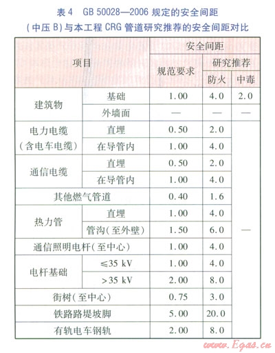 GB 50028--2006規(guī)定的安全間距(中壓B)與本工程CRG管道研究推薦的安全間距對(duì)比見表4。