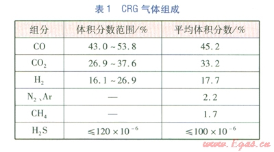 CRG是在COREX非高爐煉鐵反應(yīng)時(shí)產(chǎn)生的氣體,屬于人工煤氣,沒計(jì)輸送壓力為0.2 MPa,標(biāo)準(zhǔn)狀態(tài)下的低熱值為8.231MJ/m3,其一氧化碳含量較高,氣體組成見表1。
