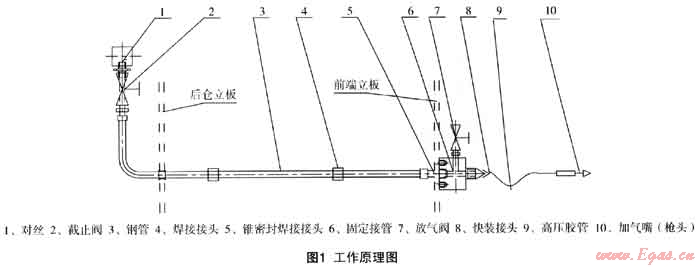 該裝置原理為利用長(zhǎng)管拖車氣瓶?jī)?nèi)天然氣和牽弓車儲(chǔ)氣瓶?jī)?nèi)天然氣的壓力差,通過(guò)快裝接頭和管道,把長(zhǎng)管拖車內(nèi)的高壓天然氣充注入牽引車儲(chǔ)氣瓶中,以達(dá)到持續(xù)補(bǔ)氣、續(xù)駛里程的目的。