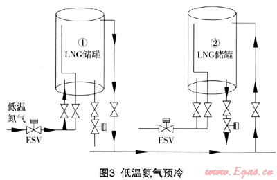 ② 低溫氮氣預冷時建議根據(jù)能量級梯使用原則,充分利用氮氣,從而節(jié)約液氮成本,參考工序如圖3:低溫氮氣從1號儲罐下進液管進、BOG氣相管出,從BOG氣相管進2號儲罐,從2號儲罐出液閥出,最后在空溫氣化器后管道進行放散。