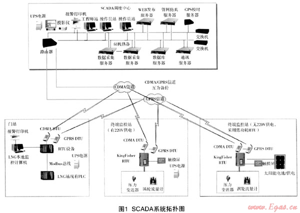 燃氣SCADA系統(tǒng)主要由主調(diào)度中心、遠程監(jiān)控站點和通信系統(tǒng)組成。調(diào)度中心主要由計算機系統(tǒng)組建,包含SCADA服務(wù)器、SCADA工作站和通信處理機等;監(jiān)控站點設(shè)備平臺由RTU/PLC組建,實現(xiàn)對現(xiàn)場儀表參數(shù)的實時監(jiān)控;調(diào)度中心與監(jiān)控站點通過通信系統(tǒng)進行監(jiān)控參數(shù)和指令的信息交換,通信處理機負責監(jiān)控數(shù)據(jù)集中和通信管理。