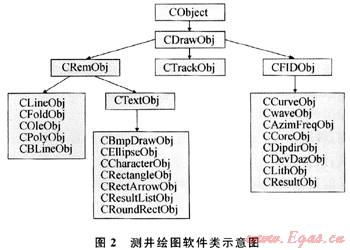 要解決這些問題,采用面向?qū)ο蟪绦蛟O計理念是最佳的選擇[3]。在圖2軟件主要類的劃分及繼承關系圖中,CDrawObj類是直接從CObject繼承而來的所有測井圖形類的基類,主要保存著圖形對象的繪圖區(qū)域(m_Rect)和當前繪圖文檔的指針(*pDoc),完成光標在屏幕上的滾動DoScroll(CScrollView*pView),保存、顯示當前光標所在位置等功能,它是測井繪圖軟件所有對象動態(tài)識別的入口。