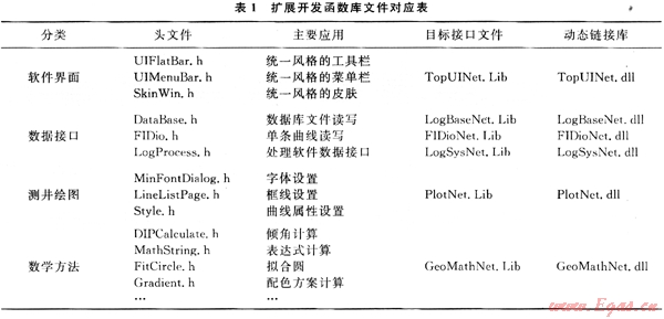 表1為用戶擴展開發(fā)中常用函數(shù)庫,這5類函數(shù)庫都進行了面向?qū)ο蠓庋b,可以較好地滿足各種層次開發(fā)人員的編程需要。表1中簡單地列出了單條曲線(常規(guī)、陣列)管理的基礎類CFIDi0和常規(guī)處理程序數(shù)據(jù)接口函數(shù)類Cl。ogProcess,以及用于測井繪圖和數(shù)據(jù)分析的函數(shù)類;C++程序開發(fā)人員可以按照Microsoft Visual Studio.net規(guī)則調(diào)用其中的類或函數(shù)來輕松完成用戶所需要的二次開發(fā)。
