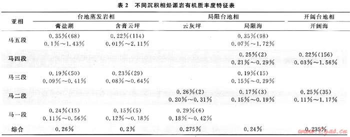 將各段不同沉積微相的有機質(zhì)豐度特征列于表2,從中可見:馬五段膏鹽湖和局限海有機質(zhì)豐度最高,均為0.35%;而含膏云坪微相較低,僅為0.22%;在馬四段,沉積環(huán)境差異導致有機質(zhì)豐度不同的現(xiàn)象較明顯,局限海有機質(zhì)豐度明顯比開闊海高,兩者分別為0.25%和0.22%;馬三段盡管形成于水體相對封閉的環(huán)境,但是各微相有機質(zhì)豐度均很低;馬二段與馬四段類似,即局限臺地比開闊臺地有機質(zhì)豐度略高,云灰坪有機碳含量為0.26%,開闊海為0.25%;馬一段云灰坪和膏鹽湖有機碳含量較高,分別為0.29%和0.24%。