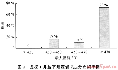下奧陶統(tǒng)海相碳酸鹽巖缺乏陸源鏡質(zhì)組,故常用等效鏡質(zhì)組反射率(VRo)來確定其熱演化程度。研究區(qū)下古生界等效鏡質(zhì)體反射率全部大于1.8%,絕大部分大于2.0%,說明烴源巖全部熱演化至高過成熟階段,大部分演化至過成熟階段。此外,龍?zhí)?井83%的烴源巖樣品,其Tmax>450℃(圖2),也反映出有機質(zhì)高熱演化程度的特征。
