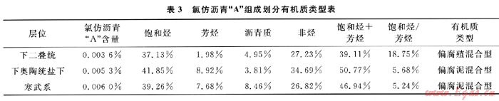 研究區(qū)氯仿瀝青“A”組成特征見表3。從表3中可見,各層位族組分中飽和烴的含量有明顯優(yōu)勢,均超過35%;芳烴和瀝青質(zhì)相對較少,均低于10%;飽芳比(飽和烴/芳烴)較高,均大于3。根據(jù)氯仿瀝青“A”組成劃分有機質(zhì)類型標準[8],將研究區(qū)古生界有機質(zhì)劃分為偏腐殖混合型和偏腐泥混合型2種類型,而鹽下地層有機質(zhì)為偏腐泥混合型,明顯好于上古生界。