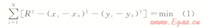 為了計算出管線低洼處的最大積液量,首先根據(jù)管線的路由數(shù)據(jù)擬合管線每個下凹段的曲率半徑(R),假設(shè)其圓心為O(x0,y0),圓弧上的離散采樣點(xi,yi)到O(x0,y0)距離的平方和最小,則由最小二乘法擬合各下凹段的曲率半徑及曲率中心的公式為:F(x0,y0,R)=