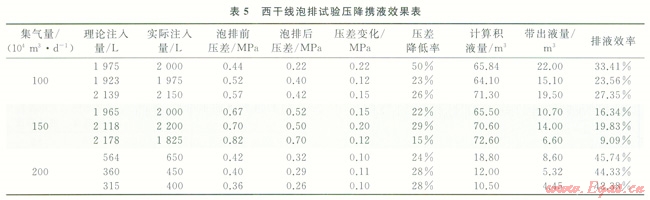 根據(jù)西干線泡排實驗數(shù)據(jù),評價泡排前后的壓差和排液效果變化,試驗壓降和攜液結(jié)果見表5。從表5可以看出:①隨著泡排劑的注入,輸送壓差總體呈現(xiàn)下降趨勢,如果實際注入量小于理論注入量,則導(dǎo)致降壓效果不佳;②在相同集氣量下,注入泡排劑量越大,壓降效果越顯著;③在相同的泡排劑注入量下,壓降與集氣量密切相關(guān),在100×104m3集氣量下,壓降為0.22MPa,集氣量為150×104m3時,最大壓降為0.20MPa,在200×104m3集氣量下,最大壓降為0.11MPa,分析認為集氣量大,氣流速度快,泡排劑與積液的作用時間短,進一步優(yōu)化注入量與集氣量、注入時間及注入制度之間的關(guān)系,確保泡排劑與積液的充分作用,以進一步提高泡排效果。
