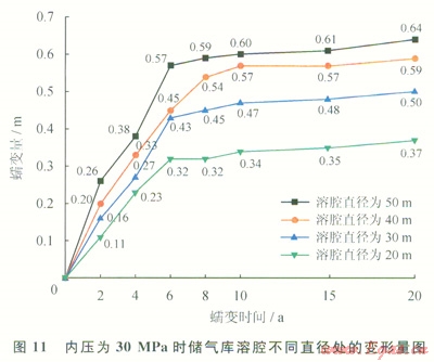 對(duì)比分析圖9~11,可以得出:①溶腔不同直徑處變形量隨時(shí)間變化規(guī)律比較一致,溶腔直徑為50m處的變形量最大;②蠕變時(shí)間為6a時(shí),不同壓力下溶腔不同直徑處變形量曲線均出現(xiàn)一個(gè)明顯的轉(zhuǎn)折點(diǎn)。蠕變時(shí)間小于6a時(shí),溶腔變形量曲線斜率較大,表明在此時(shí)間內(nèi)溶腔變形速率較大,變形比較顯著;蠕變時(shí)間大于6a時(shí),溶腔變形量曲線較平緩,溶腔變形量隨時(shí)間變化不大;③內(nèi)壓為10MPa時(shí),蠕變20a后,溶腔直徑為50m處變形量為360mm。內(nèi)壓為20MPa時(shí),蠕變20a后,溶腔直徑為50m處變形量為620mm。內(nèi)壓為30MPa時(shí),蠕變20a后,溶腔直徑為50m處變形量為640mm。數(shù)據(jù)表明,溶腔內(nèi)壓小于20MPa時(shí),溶腔變形量隨壓力增大顯著增加;溶腔內(nèi)壓大于20MPa時(shí),溶腔變形量變化不大。