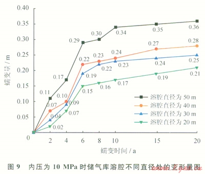 根據(jù)模擬計(jì)算所得結(jié)果,可以得到不同壓力下儲(chǔ)氣庫(kù)溶腔不同直徑處變形量圖(圖9~11),經(jīng)總結(jié)分析,僅列出具有代表性的分析圖。圖9~11分別表示溶腔內(nèi)壓為10MPa、20MPa、30MPa時(shí),不同蠕變時(shí)間鹽穴儲(chǔ)氣庫(kù)溶腔不同直徑處的變形量。