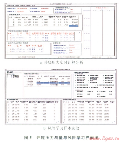 在我國某油田鉆井時(shí),應(yīng)用鉆井風(fēng)險(xiǎn)控制系統(tǒng)實(shí)時(shí)診斷鉆井狀態(tài),分別對(duì)鉆井實(shí)時(shí)數(shù)據(jù)采集軟件、鉆井實(shí)時(shí)數(shù)據(jù)庫管理軟件、鉆井風(fēng)險(xiǎn)因素實(shí)時(shí)計(jì)算分析軟件和鉆井風(fēng)險(xiǎn)推理風(fēng)險(xiǎn)軟件進(jìn)行現(xiàn)場測試(圖5、6)。以采集的鉆井實(shí)時(shí)數(shù)據(jù)為基礎(chǔ),應(yīng)用鉆井風(fēng)險(xiǎn)因素實(shí)時(shí)分析軟件計(jì)算井底壓力和地層壓力等參數(shù),以鄰井資料作為井漏風(fēng)險(xiǎn)學(xué)習(xí)的樣本,判斷該井井漏風(fēng)險(xiǎn),系統(tǒng)判斷該井在鉆至2823m時(shí)井漏風(fēng)險(xiǎn)可能性較大,當(dāng)鉆進(jìn)至2825m時(shí)技術(shù)人員發(fā)現(xiàn)井底發(fā)生漏失,決定進(jìn)行起鉆堵漏作業(yè)。現(xiàn)場測試表明鉆井風(fēng)險(xiǎn)控制系統(tǒng)的數(shù)據(jù)采集軟件與儀器測量儀器同步性好,數(shù)據(jù)庫設(shè)計(jì)合理,且井漏風(fēng)險(xiǎn)實(shí)時(shí)診斷預(yù)測結(jié)果與現(xiàn)場完全吻合。