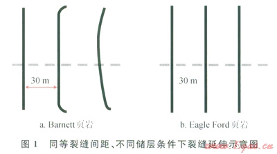 隨著工具設(shè)備及水平井改造技術(shù)的不斷進步,儲層多段改造的規(guī)模、段數(shù)等越來越多[8-9]。水力壓裂沒計師可利用分簇射孔將分段改造距離設(shè)置得越來越近,但往往過多的分簇與分段未必就帶來理想的效果,Roussel認為應(yīng)力陰影效應(yīng)的產(chǎn)生機理主要在于支撐劑的填充導致人工裂縫附近引起了應(yīng)力場的變化,蔣廷學等也在研究我國頁巖氣壓裂設(shè)計中指出,壓裂在單一裂縫脆弱面上產(chǎn)生誘導應(yīng)力的存在,并指出產(chǎn)生應(yīng)力陰影的誘導應(yīng)力可以改變最大與最小主應(yīng)力的分布,使裂縫發(fā)生轉(zhuǎn)向[10]。述研究表明,應(yīng)力陰影效應(yīng)可引起人工裂縫從水平井的橫切縫中開始偏離朝向或遠離以前的裂縫方向延伸,使得下一裂縫發(fā)生轉(zhuǎn)向。Barnctt頁巖裂縫間距30m時水平井壓裂裂縫產(chǎn)生的應(yīng)力陰影效應(yīng)如圖1-a所示,可見從第二條裂縫開始裂縫出現(xiàn)了與主縫向切的裂縫系統(tǒng),而Eagle Ford頁巖壓裂的裂縫監(jiān)測情況,同樣是30m的裂縫間距沒有出現(xiàn)裂縫應(yīng)力陰影效應(yīng)(圖1-b)。因此研究陰影效應(yīng)的產(chǎn)生機理,建立分析數(shù)學模型并進行其影響因素分析對水平井分段體積改造優(yōu)化設(shè)計及效果的提升具有重要研究與應(yīng)用價值。