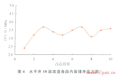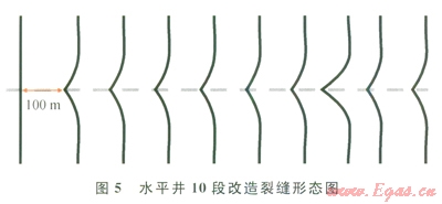 以某口致密儲層X水平井為例,水平段長度1043m,儲層有效孔隙度8%,有效滲透率0.12mD,地層孔隙壓力29.0MPa,楊氏模量25000MPa,泊松比0.2,最小水平主應(yīng)力43.2 MPa,抗張強度3.5MPa。分段改造設(shè)計6~10段。利用上述數(shù)學模型計算水平井10段改造下不同段內(nèi)的凈壓力及裂縫形態(tài)表明:100m的段間距內(nèi)裂縫將發(fā)牛轉(zhuǎn)向(圖4、5)。