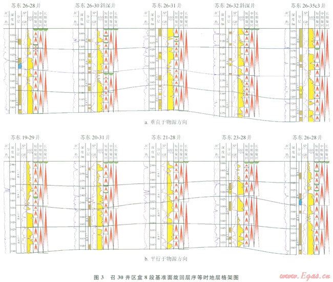 蘇里格地區(qū)盒8段砂體構(gòu)型可分為復(fù)合河道砂體和單一河道砂體,前者被稱為疊置河道砂,后者被稱為單河道砂。本文以層序地層學(xué)理論為依據(jù),在層序地層界面識別的基礎(chǔ)上,建立了召30井區(qū)盒8段高分辨率層序地層格架,通過中期基準(zhǔn)面的對比識別出疊置河道砂,進而通過短期基準(zhǔn)面的對比識別出單河道砂,并定量刻畫該地區(qū)盒8段河道帶及河道砂體規(guī)模,建立儲集砂體構(gòu)型,以期為氣田開發(fā)過程中的井距優(yōu)化和天然氣“甜點”的選擇提供依據(jù),提高氣田開發(fā)效益。