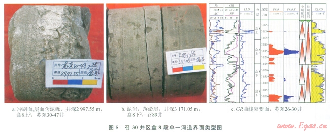 單一河道是指較長周期的大洪水期形成的具有一定分布范圍的河道單元,其識別的意義在于復(fù)合河道內(nèi)垂向上的單一河道單元的劃分,每一期次洪水的流量、流速不盡相同。因此可以依據(jù)河道內(nèi)的泥質(zhì)層、細粒沉積的發(fā)育位置、沖刷面以及測井曲線的突變來對其進行識別[20]。區(qū)內(nèi)單一河道的界面表現(xiàn)為(圖5):①沖刷面,代表洪水對前期沉積物的改造,多含泥礫;②泥巖及粉砂巖沉積,代表憩水期水體能量相對較弱時的細粒沉積,保存程度視后一期洪水能量的強弱而定;③測井曲線(GR)突變面。通過以上3種界面對召30井區(qū)盒8段短期基準(zhǔn)面旋回內(nèi)單一河道進行識別,每個短期旋回內(nèi)均發(fā)育2~3期單一河道沉積。