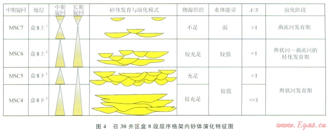 1)蘇里格氣田召30井區(qū)盒8段發(fā)育兩個長期基準(zhǔn)面旋回,4個中期基準(zhǔn)面旋回,12個短期基準(zhǔn)面旋回及若干超短期基準(zhǔn)面旋回,其中基準(zhǔn)面最高在盒8上亞段沉積初期,最低在盒8上亞段沉積末期。盒8段層序自下而上主要形成于可容納空間小于沉積物供給速率的基準(zhǔn)面緩慢上升和快速下降的地層旋回過程中,僅保存上升半旋回的向上“變深”非對稱型結(jié)構(gòu)(A型)的中、短期旋回結(jié)構(gòu)類型為主,反映出盒8段沉積時自下而上物源供給逐步穩(wěn)定,水體能量逐漸減弱的過程,與盒8段自下而上由辮狀河向曲流河轉(zhuǎn)變的這一特征相符。