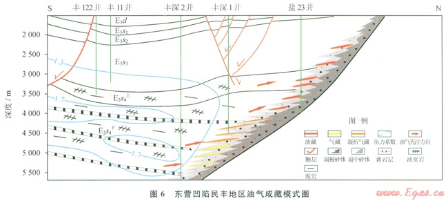 早期生烴作用與油氣充注形成超壓是陸相斷陷盆地油氣成藏的另一種類型,其條件是毗鄰斷陷深洼的陡坡帶、發(fā)育巨厚的近岸水下扇砂礫巖體和短距離的油氣運(yùn)聚(圖6)。
