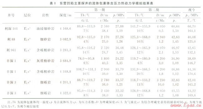 將各期次鹽水包裹體的均一溫度及其共生的同期含烴鹽水包裹體或烴類包裹體的均一溫度、氣/液比和化學(xué)組成輸入VTFLINC軟件,即可獲得熱動(dòng)力學(xué)模擬結(jié)果——各期次流體包裹體的最小捕獲壓力和壓力系數(shù)。利用東營(yíng)凹陷北帶利津、民豐等地區(qū)所采集樣品獲得“數(shù)據(jù)對(duì)”的樣品開(kāi)展了熱動(dòng)力學(xué)模擬,模擬得到了主要探井的部分古流體壓力(表1)。