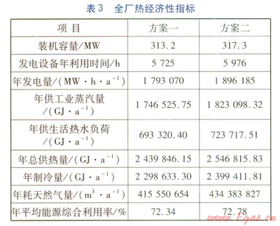 表3中,年總供熱量為年供工業(yè)蒸汽量及年供生活熱水負(fù)荷的總和;能源站采用天然氣作為燃料,天然氣的低熱值取37237.15kJ/m3,年平均能源綜合利用率為年總供熱量與年制冷量及年發(fā)電量之和與年消耗天然氣熱量之比。