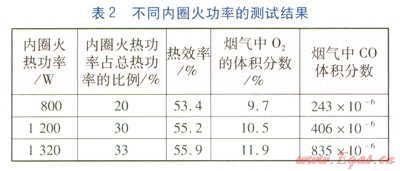 在燃燒器直徑一定的情況下,適當(dāng)增大內(nèi)圈火熱功率也可實現(xiàn)熱效率的提升。以我公司某款不帶二次空氣獨立流動通道的嵌入式燃?xì)庠顬槔紵鳠峁β蕿?span lang="EN-US">4.0kW,內(nèi)圈火熱功率所占比例為20%,即0.8kW。在試驗過程中,不斷增大內(nèi)圈火熱功率所占的比例,由20%逐步提高至30%,其熱效率逐漸增高。但增大到一定比例時,其煙氣中CO含量翻倍增長,熱效率增加減緩。不同內(nèi)圈火熱功率的測試結(jié)果見表2,具體數(shù)值變化情況與燃燒器結(jié)構(gòu)設(shè)計有直接關(guān)系,因此內(nèi)圈火熱功率應(yīng)針對具體的燃?xì)庠钸M(jìn)行試驗確定。